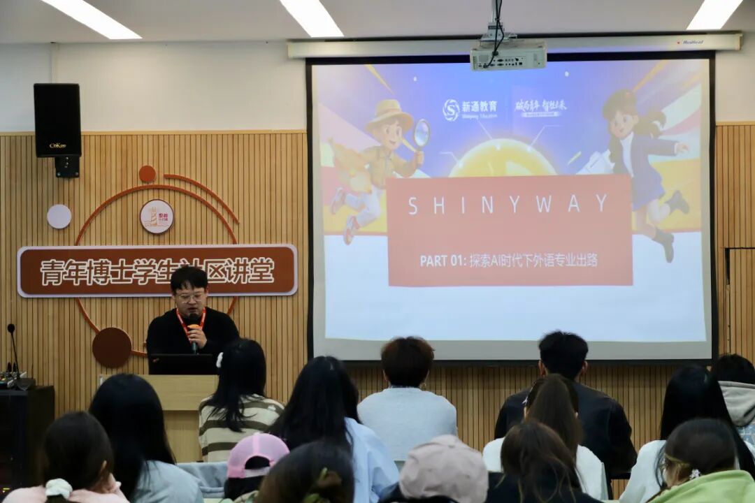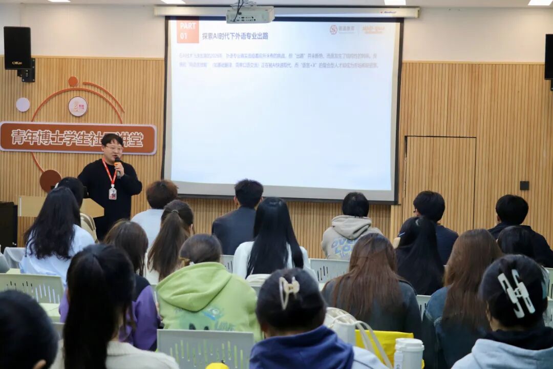 讲座伊始,吴高鹏老师结合当前行业发展趋势与人才需求,展开系统讲解。他重点分析AI时代外语专业发展出路,明确指出“外语+垂直行业”复合型人才更贴合社会与企业需求,针对性推荐外语+基础数据、中文出海等新兴赛道,引导同学们紧跟国家“十五五规划”,精准把握行业发展风口。