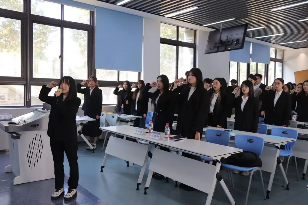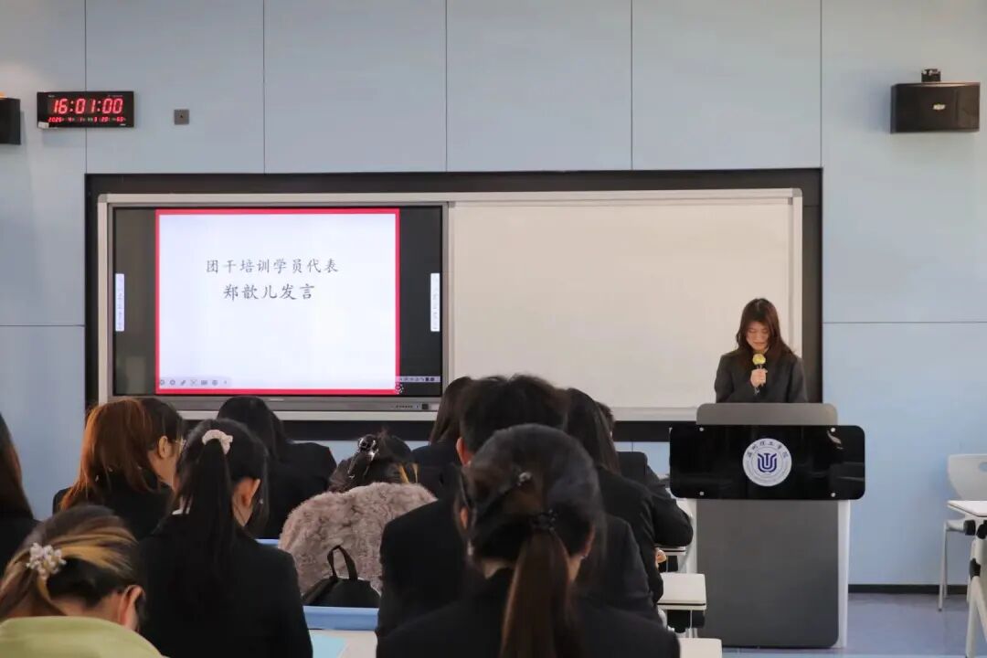 本次开班仪式以庄严的入团誓词拉开帷幕,全体学员起立宣誓,铮铮誓言尽显新时代团学干部的初心与使命。宣誓结束后,全场齐声高唱共青团团歌,激昂的旋律汇聚起青年奋进的磅礴力量。随后学员代表郑歆儿上台发言,她代表全体参训学员向学院表达诚挚感谢,并郑重承诺,将以坚定的理想信念深耕学习,以务实的工作作风躬身实践,在培训中锤炼过硬本领,用心用情服务同学。