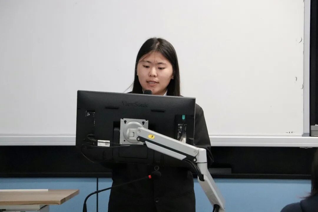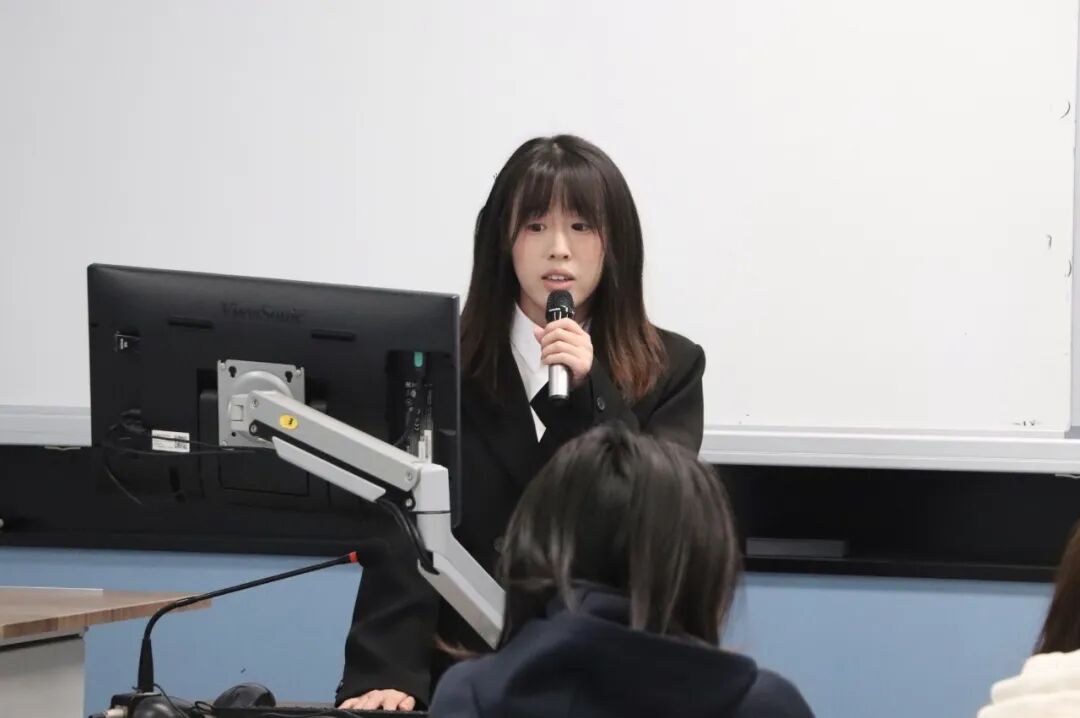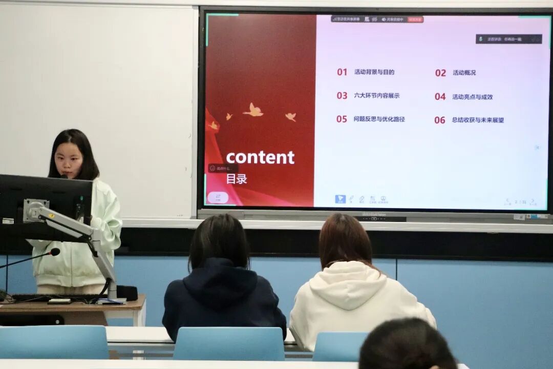 随后上场的是25 英语专升本团支部的鲁逸婷同学,她以清明节为契机,从活动背景目的、整体概况、六个团日活动成果展示、亮点成效、问题反思、总结展望六个方面,系统汇报团支部清明红色主题团日活动,展现了青年团员追思英烈、赓续红色血脉、厚植家国情怀的青春担当。