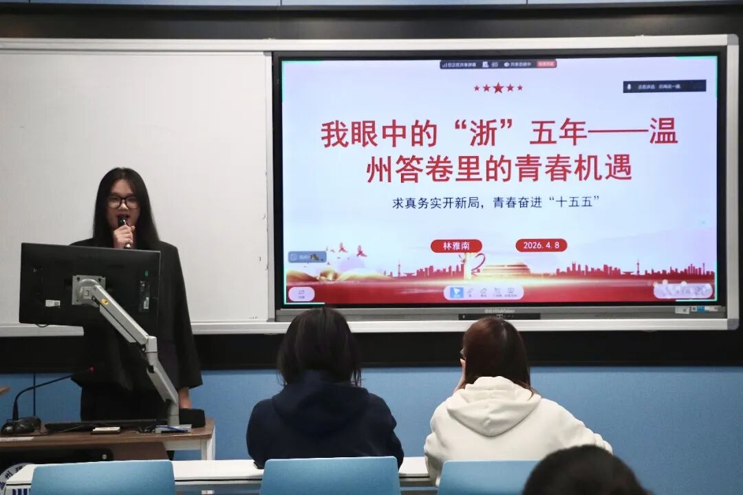 接着是 24英语一班的林雅南同学,她以“我眼中的‘浙’五年 —— 温州答卷里的青春机遇”为主题展开分享。她从温州新局、身边发展故事、青年机遇展望、奋斗的青春最美四个方面展开,结合数安港、眼谷、乐清电气集群等鲜活案例,号召青年将个人成长融入温州 “十五五” 建设,以实干奋进助力温州冲刺万亿之城。